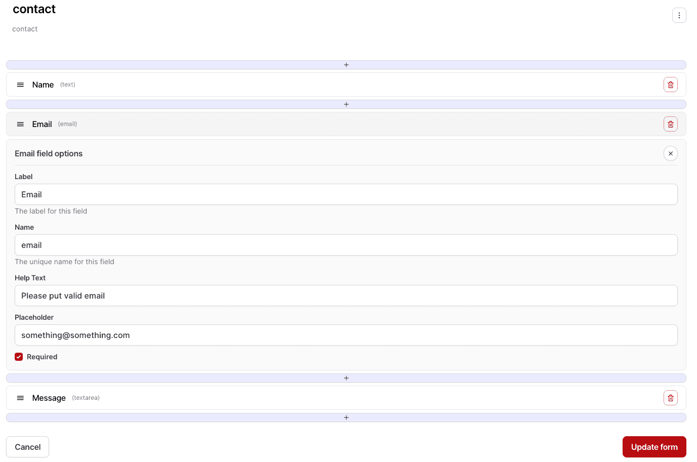 Once your new form is created, you'll be redirected to the form settings page. Here you can add the desired fields for the form. In our example, we'll create the Name, Email, and Message fields.