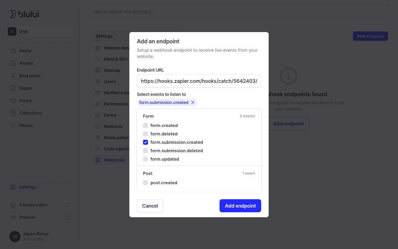form.submission.createdevent. For the purpose of this guide we'll only select 1 event to subscribe to. - Click Add endpoint to create the event subscriber for the project.