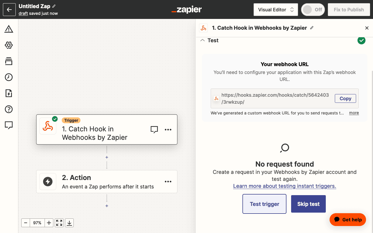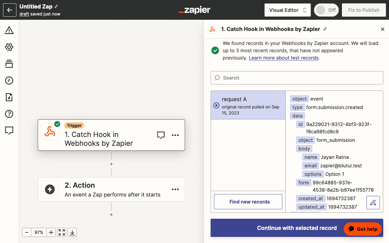 Now that we've created a webhook endpoint and subscribed to the form.submission.created event, lets test it by submitting a form. Once you have submitted a form on your project's frontend, we can test the Trigger in Zapier is setup correctly. Click the Test trigger button in Zapier to load any requests that were triggered by the Blutui project.